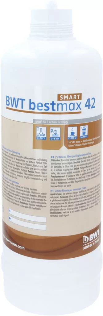 A BWT bestmax SMART 42 vízszűrő patron a professzionális megoldás erre a problémára. Ezt az univerzális szűrőt kifejezetten a gasztronómiai igényekhez fejlesztették ki, legyen szó kávégépekről, italautomatákról vagy akár kombi párolókról. Az innovatív High-Efficiency-Technology (HET) technológiának köszönhetően a vízoptimalizálás minden eddiginél hatékonyabb, maximális védelmet nyújtva a vízkő ellen.