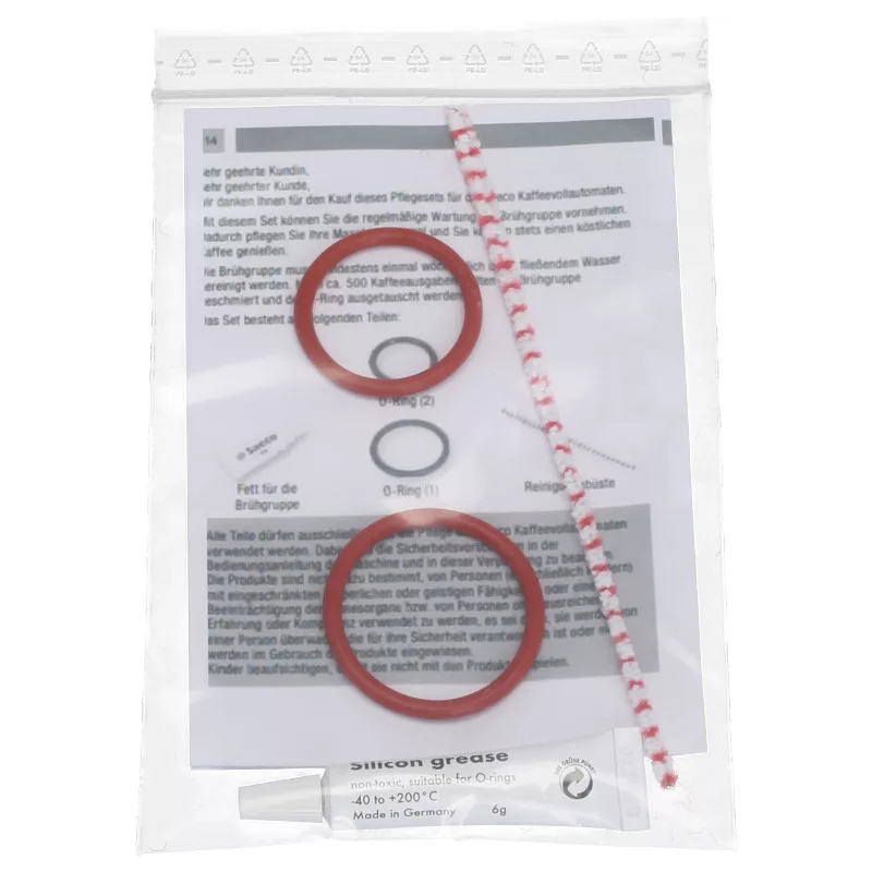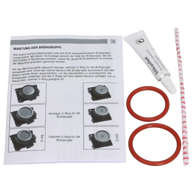 Saeco karbantartó készlet a főzőegységhez. A gyártó javasolja a tömítések cseréjét évente egyszer. A készlethez útmutató is tartozik.