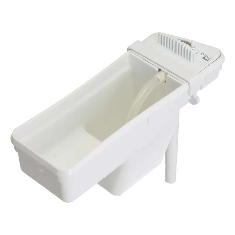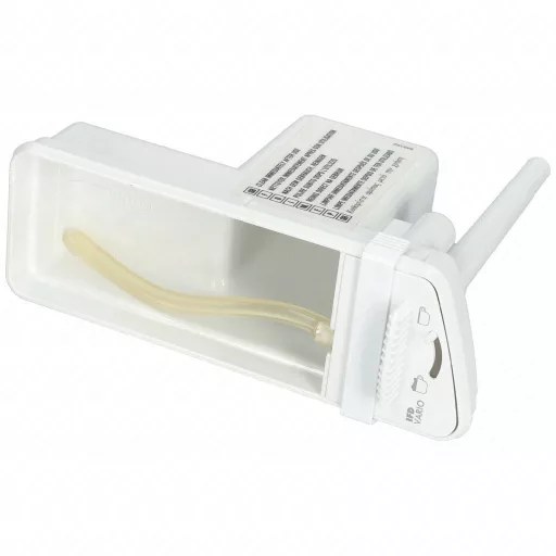Ez a fehér műanyag tejtartály szilikoncsővel érkezik. A hozzá tartozó fedél külön rendelhető.