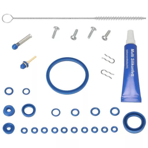 A tömítéseken kívül szilikonzsírt, tisztítókefét és rögzítőcsavarokat is tartalmaz a teljes körű munkához.