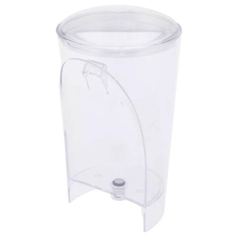 Átlátszó műanyag víztartály fedéllel és kifolyószeleppel.